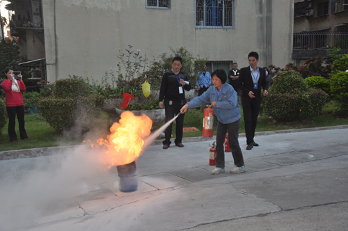 緊接著指揮人員讓參加演練的人員在大樓前集中,教官現場講解和演示用干粉滅火器滅火的要領,并讓參演人員使用干粉滅火器現場滅火體驗。演練結束后,安全管理部人員就本次演練活動進行了分析和小結。