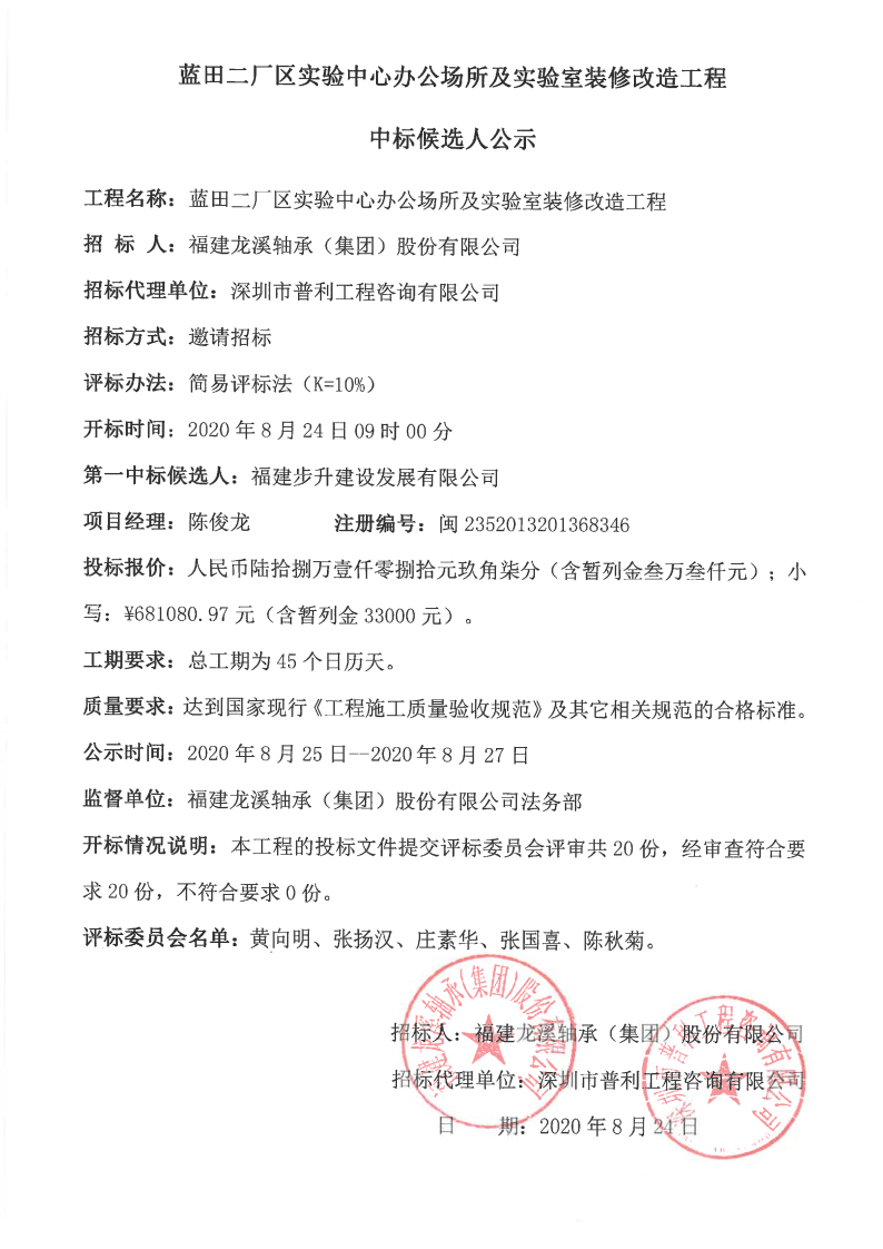 龍軸集團藍田二廠區實驗中心辦公場所及實驗室裝修改造工程中標候選人公示