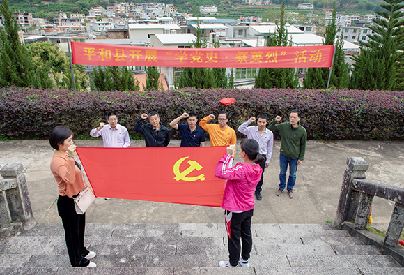 在平和暴動烈士紀念碑前,紅旗黨總支書記林玉應率全體人員向烈士紀念碑敬獻花籃,然后帶領全體黨員重溫入黨誓詞,回望入黨初心,接受心靈的凈化和洗禮。緊接著,在講解員羅燕軍的帶領下,大家參觀了平和暴動紀念館,聆聽了平和暴動歷史及朱積壘等烈士的故事。