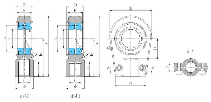 產品特點:帶鎖口桿端關節軸承由桿端體和向心關節軸承GE…ES組裝而成,用擋圈固定,d<60,桿端體材料是碳鋼,60≤d≤90,桿端體材料是碳鋼或球墨鑄鐵,d>90,桿端體材料是球墨鑄鐵,SIR…ES桿端體的內螺紋帶有鎖口,配有螺釘緊固;SIRN…ES桿端體無鎖緊螺釘,均可通過油杯潤滑。