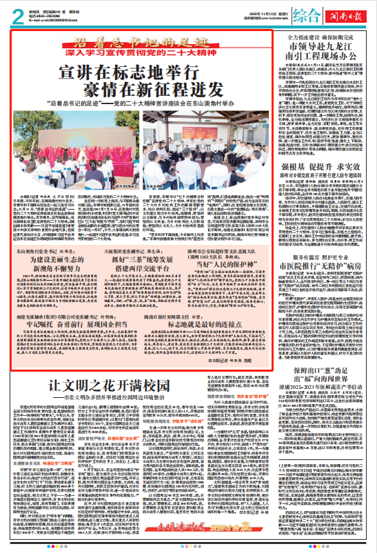本報(bào)訊(記者 邱丹燕 文 嚴(yán)潔 圖)初冬早晨,風(fēng)和日麗,在閩南漁村的休息亭,市領(lǐng)導(dǎo)和干部群眾圍坐在一起交流學(xué)習(xí)體會(huì)。11月11日,“沿著總書記的足跡”——黨的二十大精神宣講座談會(huì)在東山縣陳城鎮(zhèn)澳角村舉辦。市委常委、宣傳部部長、統(tǒng)戰(zhàn)部部長吳衛(wèi)紅宣講黨的二十大精神。《閩山閩水物華新——習(xí)近平福建足跡》重要讀本中涉及漳州的重要標(biāo)志地代表、黨媒記者代表依次發(fā)言,深情回顧習(xí)近平總書記當(dāng)年在福建工作期間到漳州調(diào)研考察的殷切囑托,暢談學(xué)習(xí)黨的二十大精神體會(huì)。