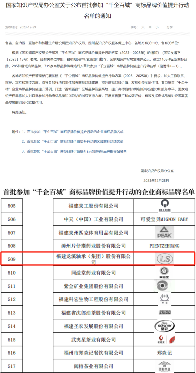 近日,國(guó)家知識(shí)產(chǎn)權(quán)局公布了首批“千企百城”商標(biāo)品牌價(jià)值提升行動(dòng)名單,龍軸集團(tuán)成功入選“企業(yè)商標(biāo)品牌名單”,成為全國(guó)首批1105家(其中:福建省43家,漳州市3家)入選名單之一,集團(tuán)品牌知名度和美譽(yù)度再上新臺(tái)階。