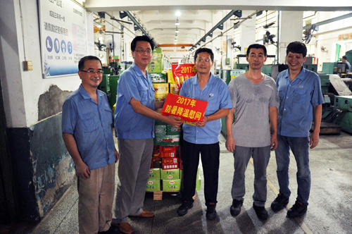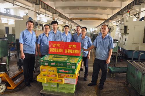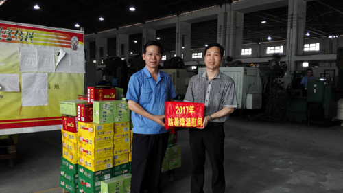 ????2017年8月21日下午,公司黨委書記董事長曾凡沛、總經(jīng)理陳晉輝、副總經(jīng)理張逸青、工會(huì)主席康安偉一行前往金田公司鍛工車間、車工一車間、車工二車間、成品五車間、熱處理車間等生產(chǎn)現(xiàn)場慰問堅(jiān)守崗位的職工,并送去涼茶、菊花茶、冬瓜茶等防暑降溫物品,讓他們?cè)谘籽紫娜罩懈惺艿疥囮嚽鍥觥?