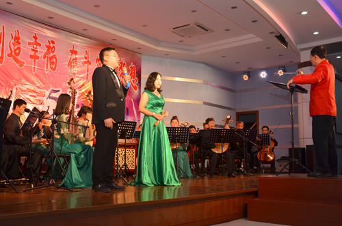 當晚,公司俱樂部燈光璀璨,樂聲歡騰。隨著強勁的鼓點響起,開場舞《騰龍鼓樂》拉開了整場晚會的序幕,隨后,公司“老”歌手曾艷輝及團委組建的舞蹈隊帶來了精彩的歌伴舞《雙腳踏上幸福路》,“新”歌手張錚聲情并茂地演繹了歌劇《江姐》選段《我為共產主義把青春貢獻》及民歌《桃花紅杏花白》,龍通藝術團的歌手李紅英、吳罕帶來的獨唱《好日子》、《我愛你中國》喜慶激昂,羅斌峰的笛子獨奏《牧民新歌》及樂團現場演奏的《龍江歡歌》、《紅樓夢插曲》、《蘇南小調》余音繞梁,男歌手熊凱、溫煥振的男聲獨唱《格桑梅朵》、《懷念戰友》、《駿馬奔馳保邊疆》、中央民族大學聲樂碩士郭源源為大家帶來的《海風陣陣》、《一杯美酒》大氣悠揚。
