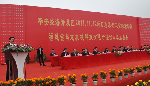 2011年11月12日,在第三屆海峽兩岸現代農業博覽會·第十三屆海峽兩岸花卉博覽會即將召開之際,公司全資子公司——福建金昌龍機械科技有限責任公司在漳州市華安經濟開發區舉行了盛大的奠基典禮!漳州市市長吳洪芹及洪仕建、陳少青等市領導親臨慶典現場并為項目揭彩、培土,華安縣委書記柯志宏、縣長沈建平率華安縣相關部門負責人,公司黨委書記、董事長曾凡沛、總經理許廈生、常務副總經理陳晉輝率全體中層主管參加了奠基典禮。公司黨委書記、董事長曾凡沛在慶典上發表了熱情洋溢的致辭