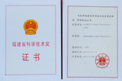 公司關節軸承產品技術創新平臺建設喜獲2012年度福建省科學技術進步獎一等獎